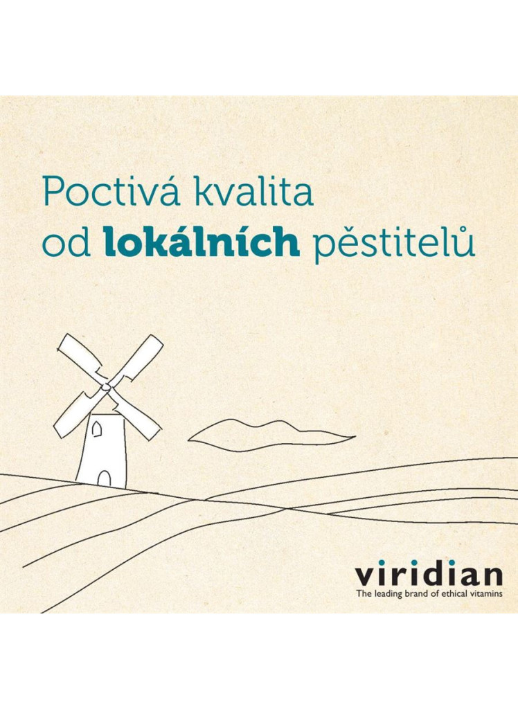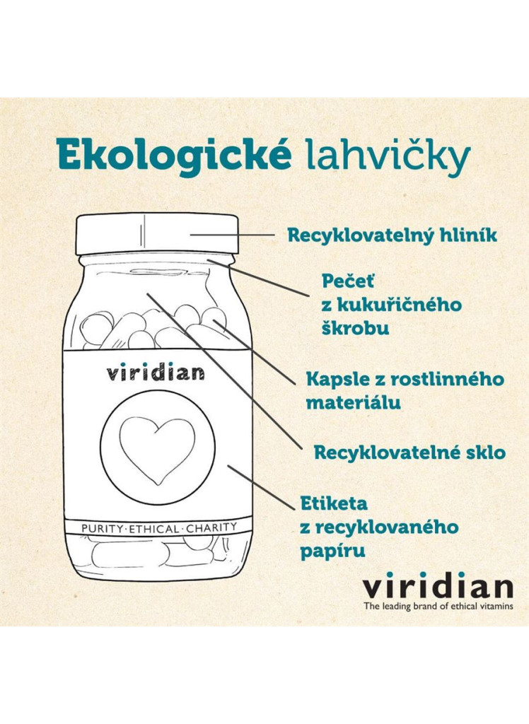 Produkty značky Viridian Nutrition obsahují pouze čistou směs bioaktivních složek = 100% aktivních látek a 0% balastních aditiv a pojiv. Viridian Nutrition garantuje špičkovou kvalitu a čistotu svých produktů důslednou kontrolou celého výrobního procesu. A to od semínka až po finální produkt = spolupracuje s lokálními producenty a pěstiteli zaměřenými na nejvyšší kvalitu. Z etických důvodů nepoužívá značka Viridian Nutrition ve svých produktech žádný palmový tuk a netestuje své produkty na zvířatech. Všechny obaly produktů jsou 100% ekologické.