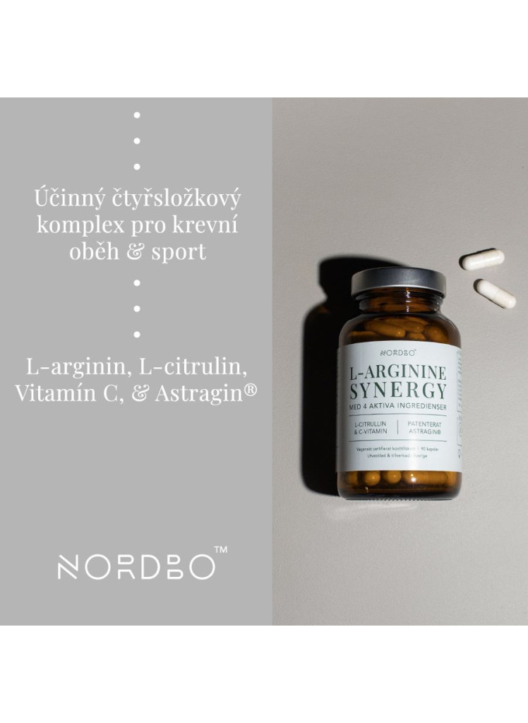 L-Arginine Synergy je synergický komplex, který kombinuje aminokyseliny L-arginin a L-citrulin s vitaminem C (ve formě askorbátu vápenatého) a AstraGin®. L-arginin je semiesenciální aminokyselina, L-citrulin se v těle přeměňuje na arginin a je považován za látku, která udržuje hladinu argininu delší a stabilnější. Kombinace L-argininu a L-citrulinu je obzvláště prospěšná pro vytrvalost a optimální cirkulaci krve (vytrvalost + dlouhověkost) – ale také v dalších situacích, kde jsou tyto vlastnosti žádoucí. Vitamin C ve formě askorbátu vápenatého je neacidická forma šetrná k žaludku, vitamín C přispívá k ochraně buněk před oxidačním stresem, k udržení normální funkce imunitního systému a ke snížení únavy a vyčerpání. AstraGin® je patentovaný rostlinný extrakt z astragalu a ženšenu, u něhož bylo ve studiích prokázáno, že podporuje vstřebávání aminokyselin.