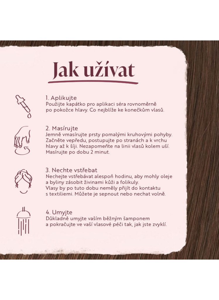 Pro posílení hloubkového účinku olej a bylin obsažených v Hair Restore Serum, opakujte tuto regenerační proceduru (masáž) pokožky hlavy pokaždé s aplikací séra (1-3x týdně). Samotnou masáž lze aplikovat i bez použití séra pro stimulaci kůže a vlasových folikul.