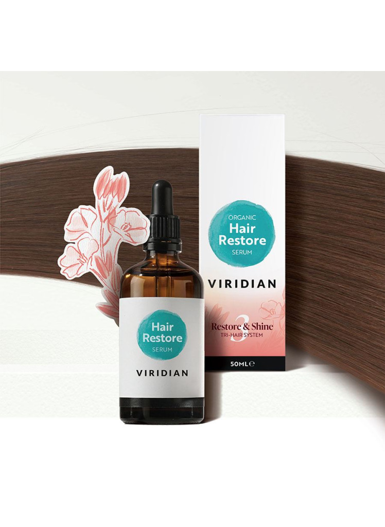 Viridian Hair Restore Serum je směsí jemných organických rostlinných olejů ze semen, které byly pečlivě lisovány za studena, aby si zachovaly svou nutriční kvalitu. Jsou doplněné o organické esenciální oleje destilované z čerstvých bylin, včetně rozmarýnu a levandule. Vyživující kombinace arganového, pupalkového a světlicového oleje přispívá k lesku a zářivosti vlasů. Toto lehké, nemastné složení proniká hluboko do vlasů, doplňuje hydrataci, pomáhá opravovat poškození a zvýrazňuje přirozený lesk vlasů.