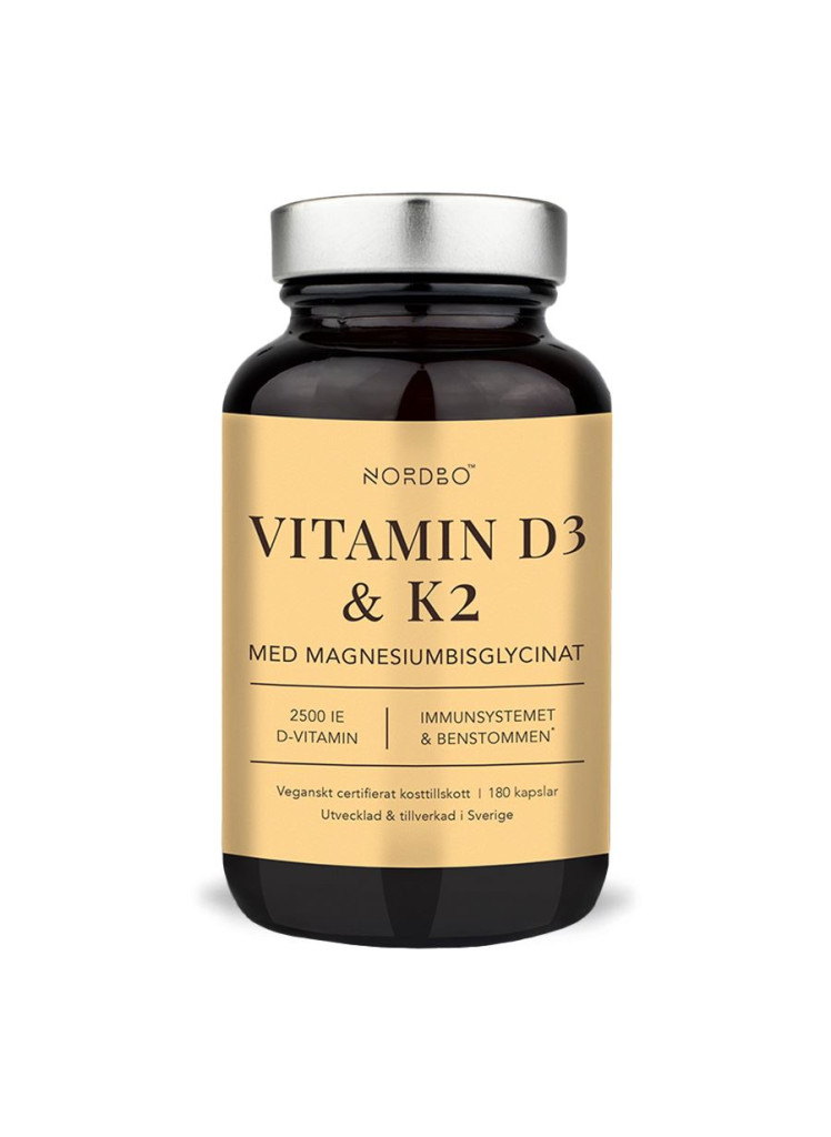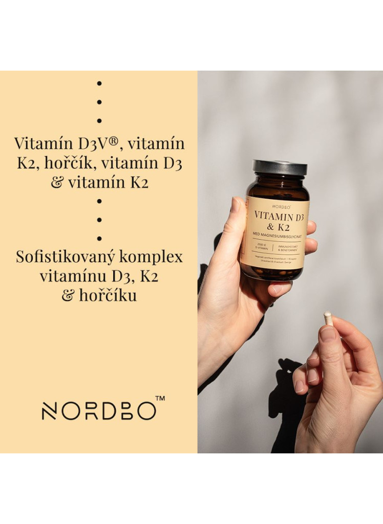 Vitamin D3 & K2 + magnesium (nově v balení 180 kapslí) obsahuje tři složky zaměřené na oblast imunitního systému a stavu kostí, které působí ve velmi efektivní vzájemné synergii. Vitamín D3 zvyšuje vstřebávání vápníku do organismu a ovlivňuje tvorbu kostní hmoty, vitamín K2 zajišťuje, že vápník je transportován na správná místa, a hořčík funguje v těle jako aktivátor vitamínu D3.