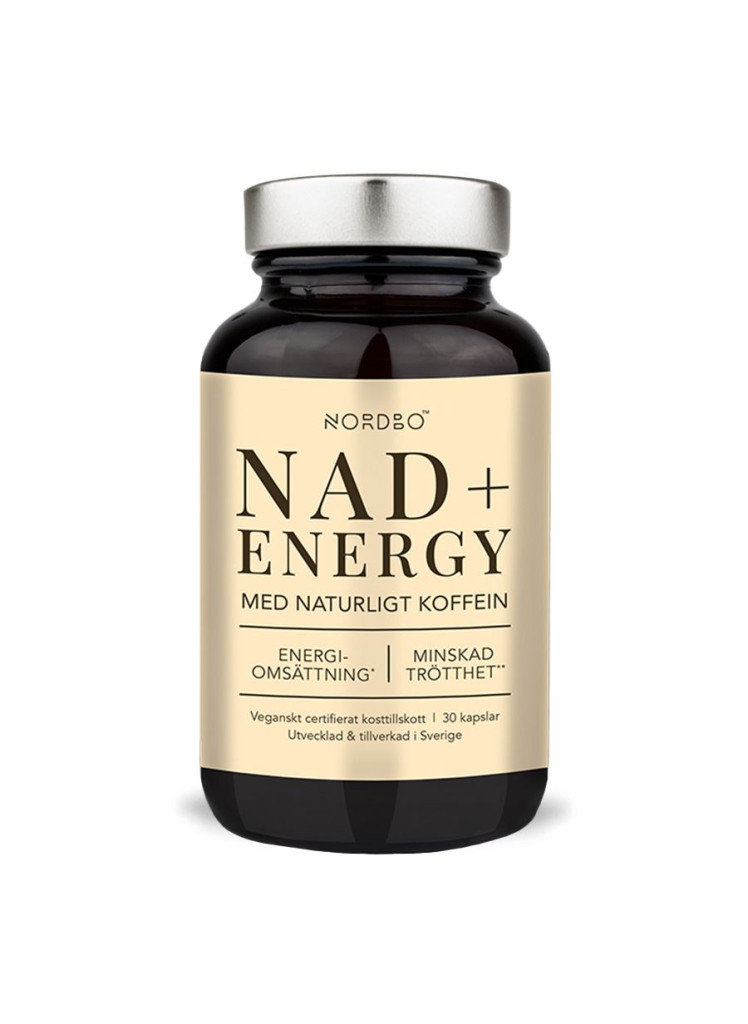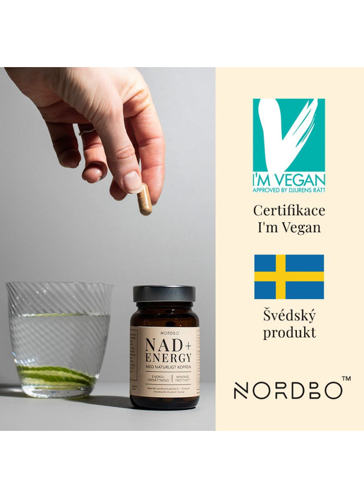 Nordbo NAD+ Energy je synergický komplex určený pro podporu energie a zdravého stárnutí. Přispívá k normálnímu energetickému metabolismu, psychické činnosti a snížení únavy a vyčerpání. Obsahuje pět aktivních složek - nikotinamid ribosid chlorid (NR), extrakt z kořene galgánu enXtra®, přírodní kofein z guarany, koenzym Q10 a vitamin B12.